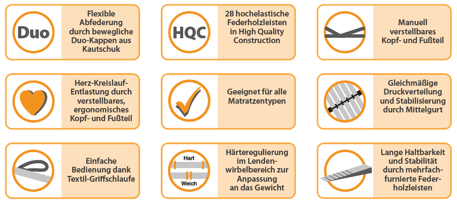 28 mehrfach furnierte Federholzleisten mit Mittelgurt, Kopf- und Fußteil verstellbar