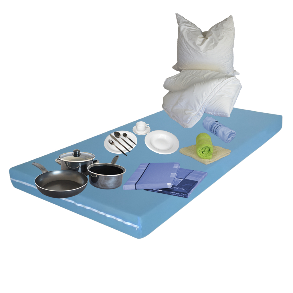 Starterset komplett mit Geschirr, Töpfen, Bettwäsche und Matratze