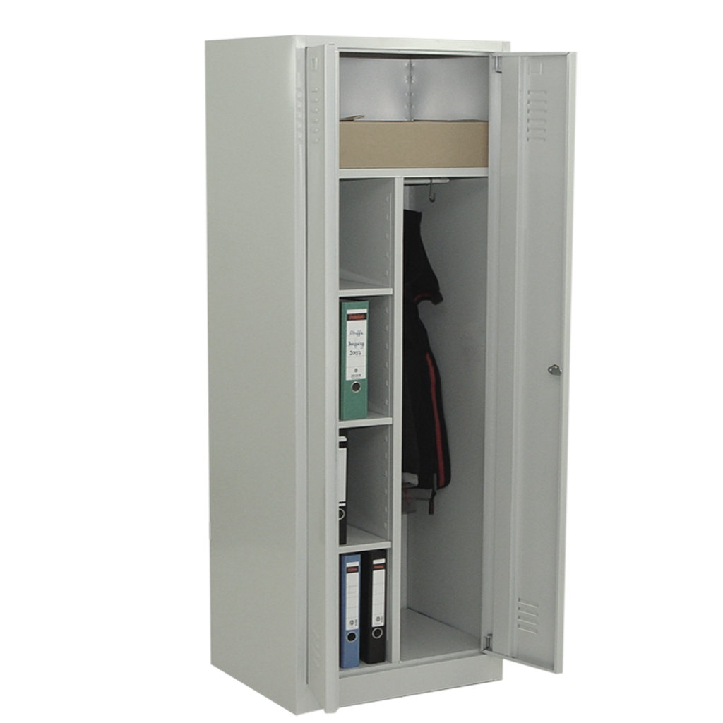 Dieser Schrank ist für eine Person zugeschnitten. Der Hutboden geht über die gesamte Schrankbreite und bietet so viel Stauraum auch für größere Gegenstände. Im linken Abteil ist Platz genug für Ihre Wäsche oder auch für Aktenordner. Rechts ist eine Kleiderstange mit Haken, somit braucht man kein Kleiderbügel.
